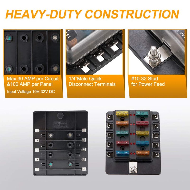 - LED INDICATOR FOR BLOWN FUSE---Each circuit has red LED warning indication.If a fuse blows,the red LED next to the problem fuse will illuminate,allowing you easily identify and replace blown fuses immediately without guessing!