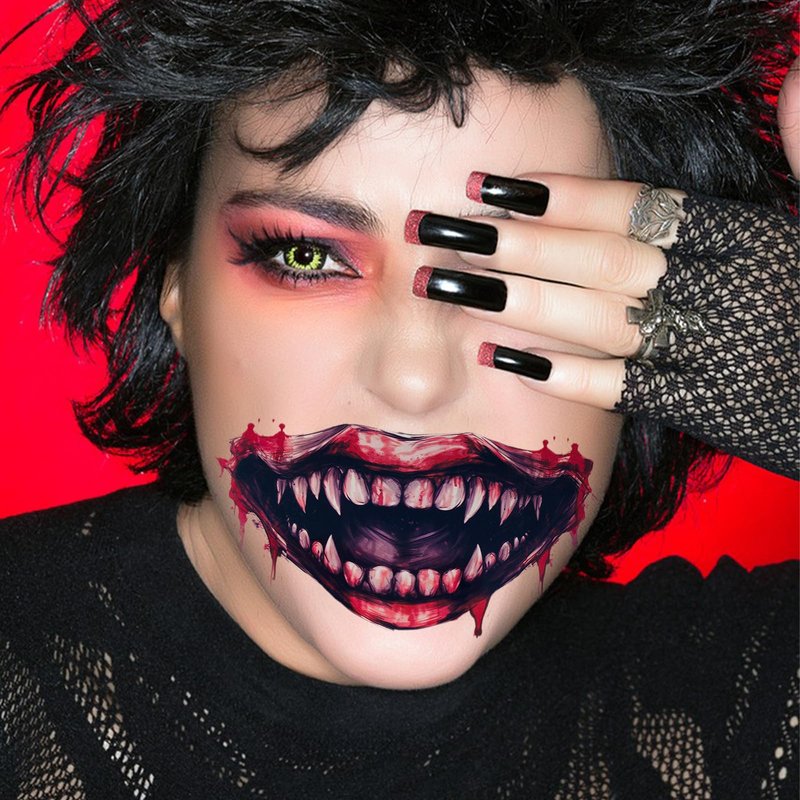 - 【Halloween smile tattoo】 Beautiful and realistic Halloween elements temporary tattoos to create your unique personality. Great for Halloween costume parties, gatherings, cosplays, arts and crafts projects, party supplies decorations, etc. Suitable to apply on arm, face, hand, neck, shoulder or wherever you like.