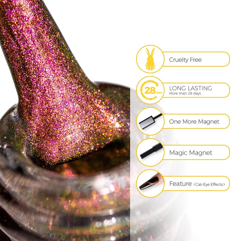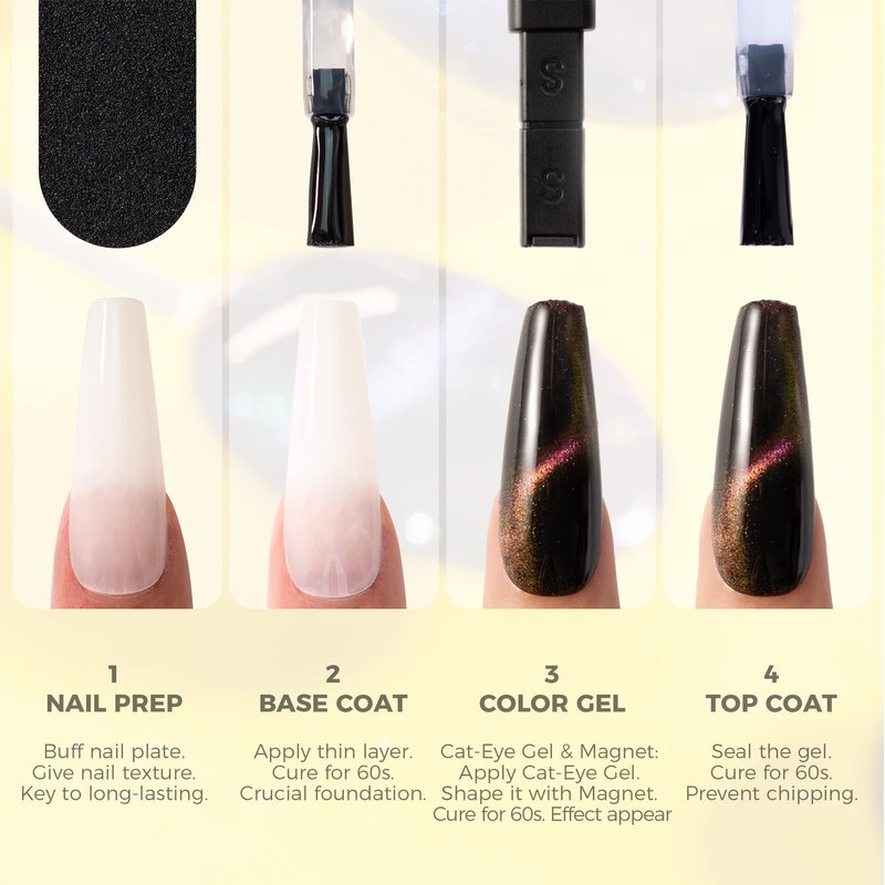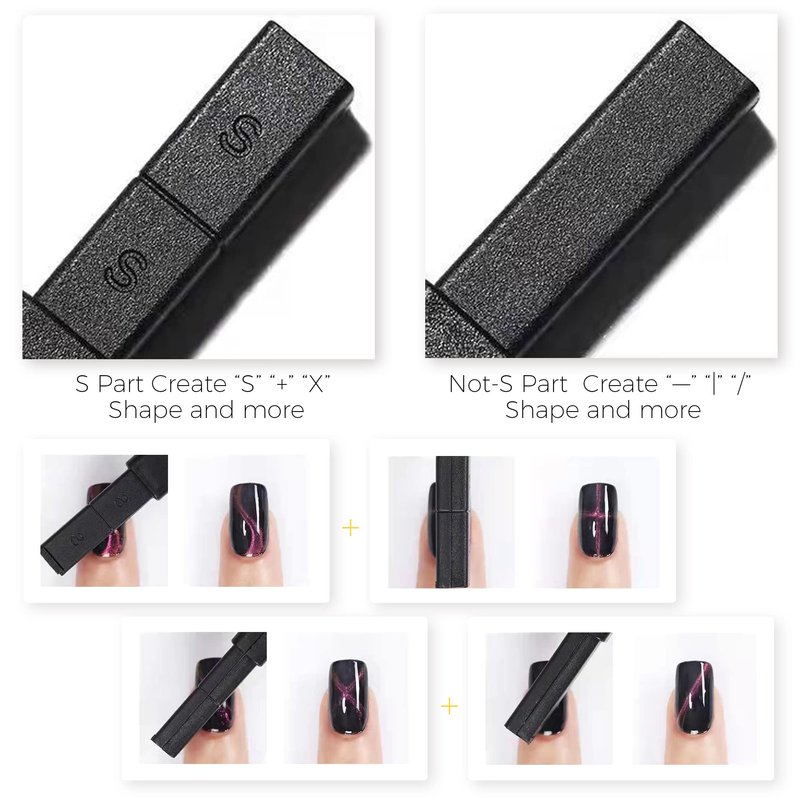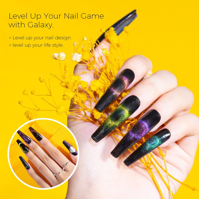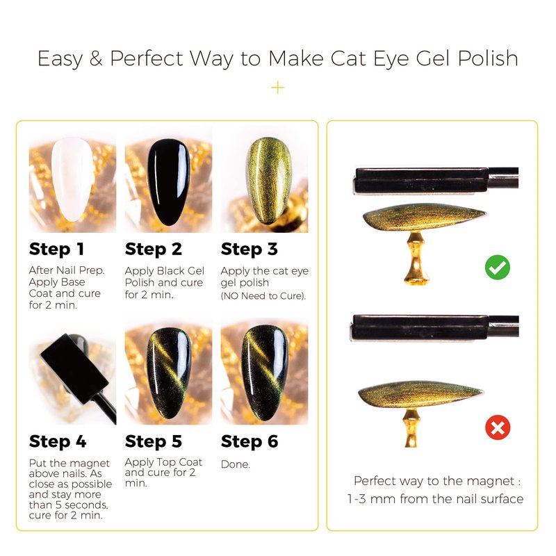 - Easy 3 Steps – First use the basecoat and cured by led lamp, apply the Black Gel Nail Polish and cure the led lamp, apply Cat Eye Gel Nail Polish and use the Magnet to create out the effect you like and cured by led lamp, apply topcoat and cured by led lamp , DONE!