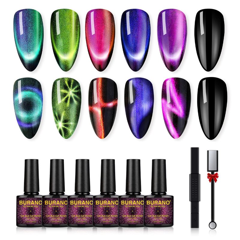BURANO 9D Cat Eye Gel Polish - Magnetic Nail Polish 6 Colors Set Holographic Cats Eyes Gel Nail Polish Gel with Magnet Stick Set Cateye Soak Off UV LED Gel