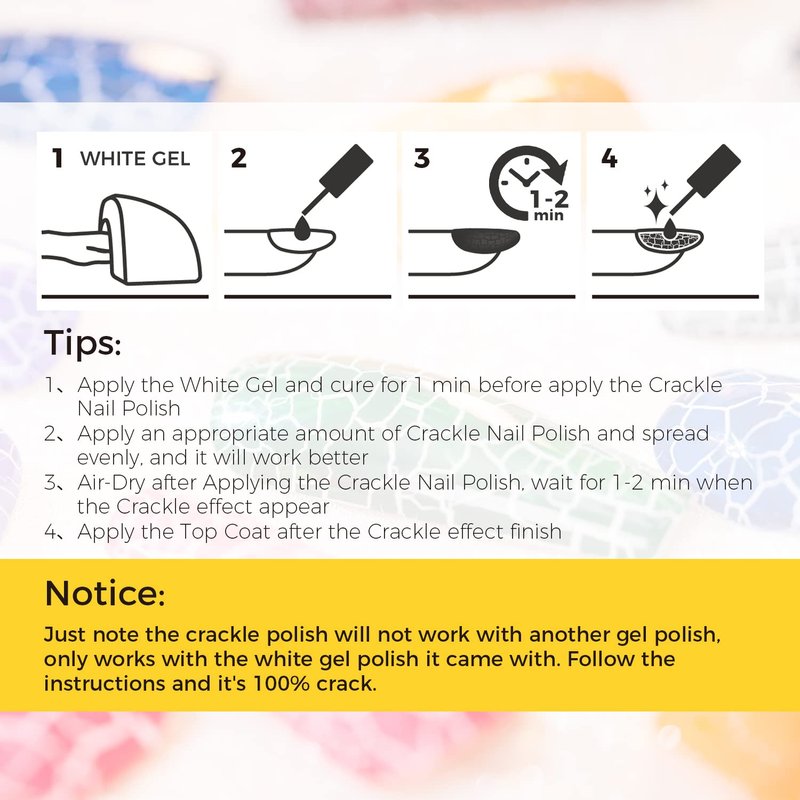 - Notice:Just note the crackle gel polish will not work with another gel polish, only works with the white gel polish it came with. Follow the instructions and it's 100% crack