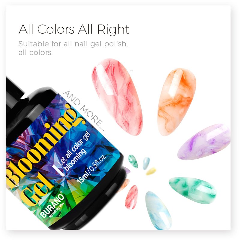 - Amazing Consistency Watercolor Nails Blooming Effects : BURANO Clear Blooming Gel, suit for all nail art system, u can pick the base colors and all the gel polish can bloom out gorgeous effect