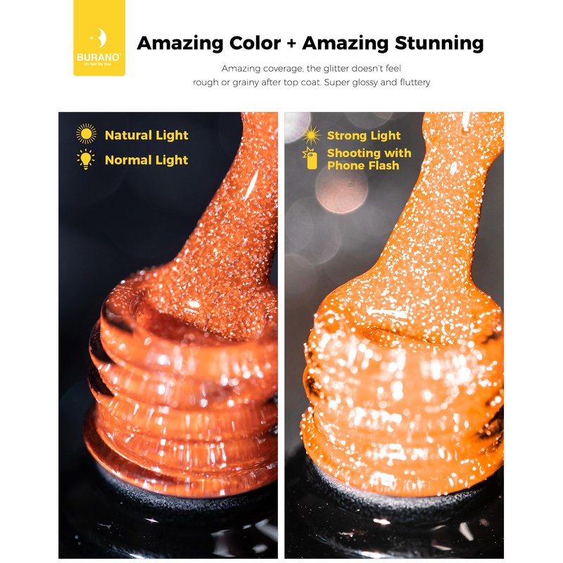 - Upgraded Version Glitter Colors Reflective Nail Polish: BURANO nail gel polish is low odor. Shining like diamond, BURANO glitter gel polish Reflective Sparkling Nail Polish makes the super shining gel