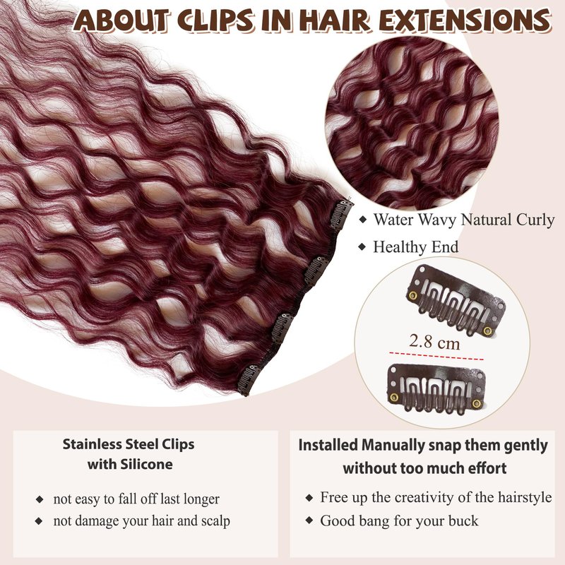 Burgundy Clip in Hair Extensions, Clip in Long Wavy Hair Extensions Human Hair 70G 7PCS Curly Clip in Hair Extensions for Women 18 Inch Long Remy Real Hair Hairpieces for Daily Party Use