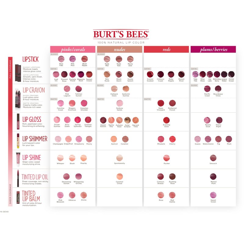 - 12 SHADES: Pucker up and find the perfect hue for your skin tone! Burt's Bees Lip Gloss comes in 12 flattering shades ranging from pinks, nudes, reds and plums