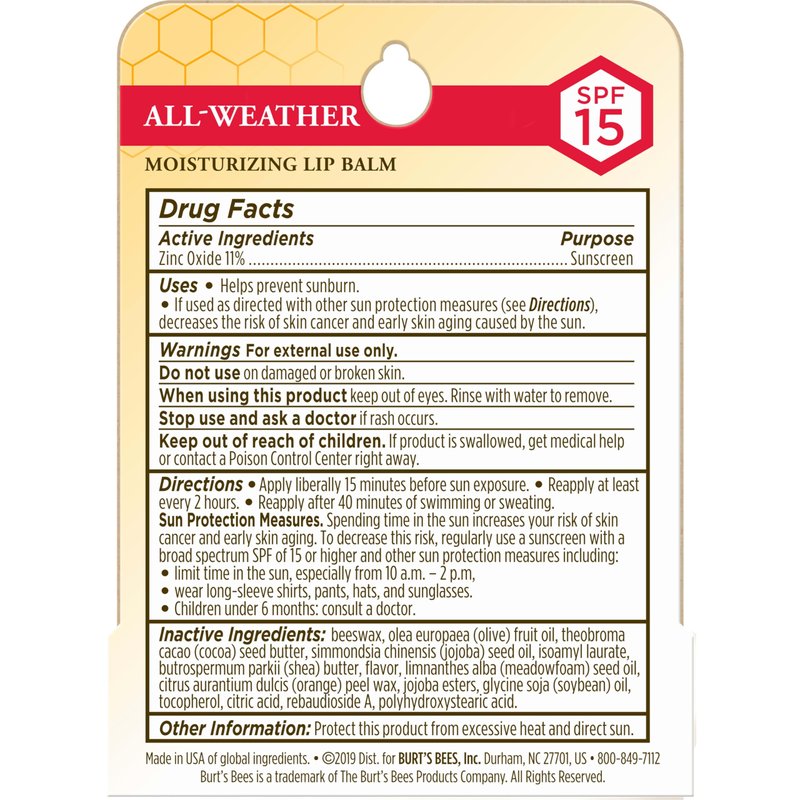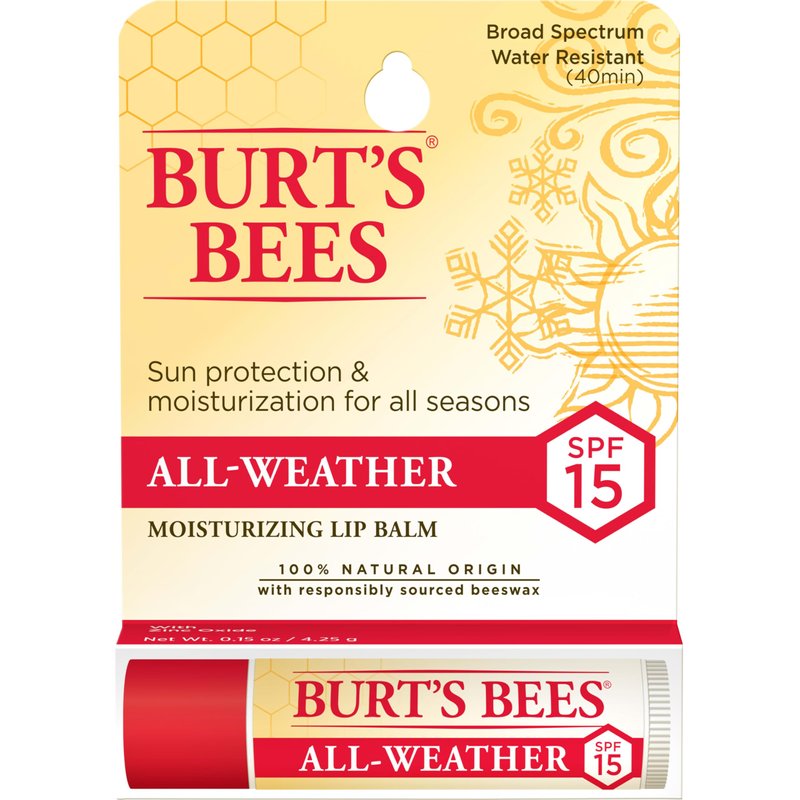 - MOISTURIZING LIP BALM PACK: One blister package contains one 0.15 oz. lip balm tube of Burt’s Bees All Weather SPF 15 Moisturizing Lip Balm that moisturizes and softens your lips all year long