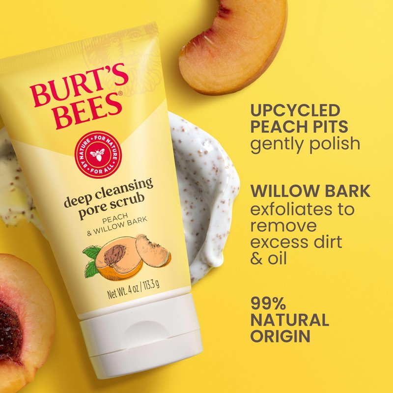 - FACIAL SCRUB: Discover the natural cleansing power of Burt's Bees facial scrubs with this peach and willow bark deep pore scrub that leaves skin refreshingly clean while gently exfoliating the surface; package may vary