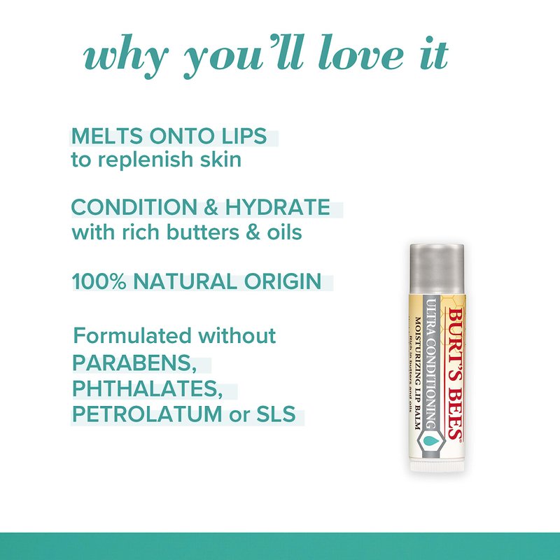- ULTRA CONDITIONING LIP BALM: One package contains two 0.15 oz. lip balm tubes of Burt’s Bees Ultra Conditioning Moisturizing Lip Balm to hydrate and condition dry lips
