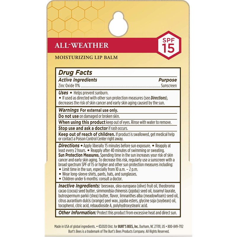 - MOISTURIZING LIP BALM PACK: One blister package contains two 0.15 oz. lip balm tubes of Burt’s Bees All Weather SPF 15 Moisturizing Lip Balm that moisturizes and softens your lips all year long