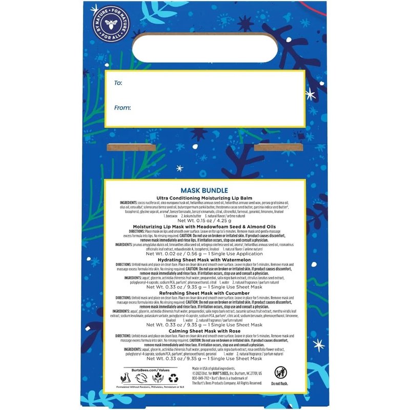 - Give your loved ones the gift of self-care and pampering with this Burt's Bees Mask Bundle Lip Balm, Lip Mask and Face Sheet Mask Gift Set.