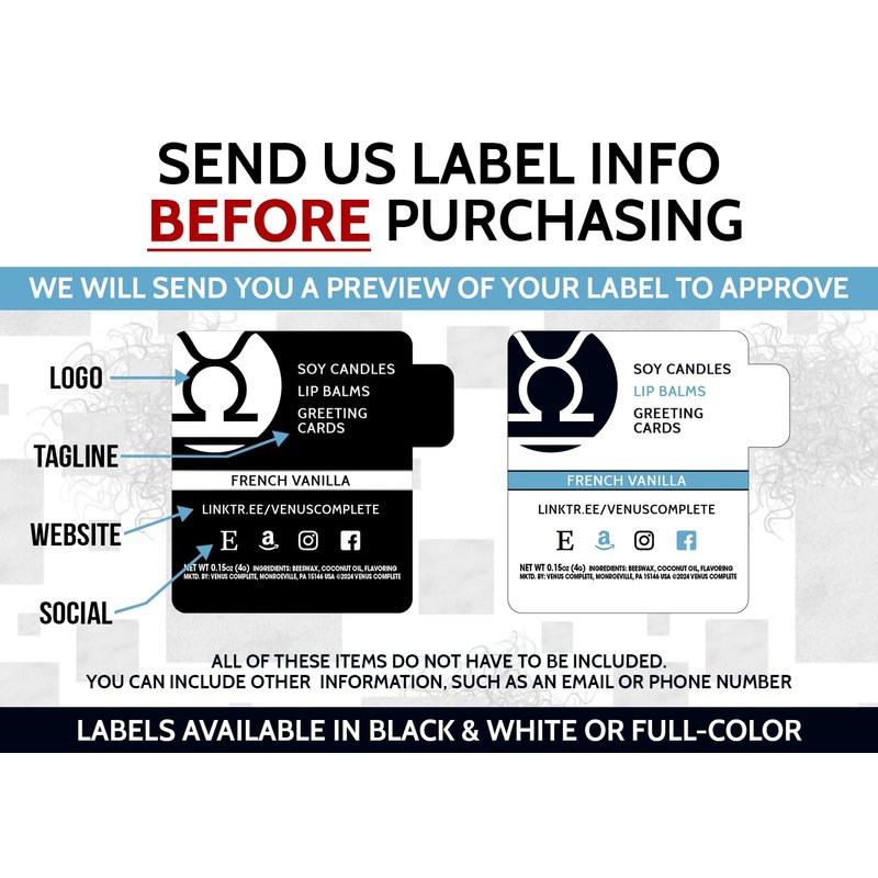 10% OFF $30+ 15% OFF $50+ 20% OFF $75+ 25% OFF $120+ Upload your logo & enter your label information. Message us everything for a free preview before you orderChoose a pack size and let us know which flavor(s) and labels(s) you want! Mix & match! Flavor Options: Cherry Spearmint French Vanilla Birthday Cake Strawberry Cheesecake Mango Peach Fusion Blue Raspberry Peppermint French Toast Green Apple Piña Colada Pumpkin Cheesecake Coconut Cream Cappuccino Chocolate Mint *If flavors are not stated under the personalization section, we'll send you our favorites! Lip balm helps protect and nourish dry chapped lips. Our .15oz lip balms are handmade in small batches and formulated using high-quality flavoring oils and beeswax. They contain no artificial colors. INGREDIENTS: Beeswax, Coconut Oil, Flavoring Contact: venuscomplete@gmail.com If you have any questions, please reach out to us and we will get back to you as soon as possible. COPYRIGHT 2024 VenusComplete