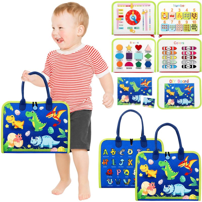 Our busy board will keep your child busy for a while, taking things off and putting them back on and figuring out all the little clasps. This upgraded busy board offers a lot of interesting activities for your kids to play, including the following: 1.A to Z Alphabets Patterns Learning 2.Life Skills Learning (zipper, buckles, gears, etc.) 3.Clock and Calendar Learning (months, week, etc.) 4.1 to 10 Numbers Learning 5.10 Colors Learning (red, orange, pink, blue, green, yellow, etc.) 6.12 Shapes Learning (circle, triangle, square, rectangle, etc.) 7.Detachable DIY Board (puzzle game) 8.Dinosaur Element Patterns 9.Life Skills Learning (shoelaces, buttons, etc.)