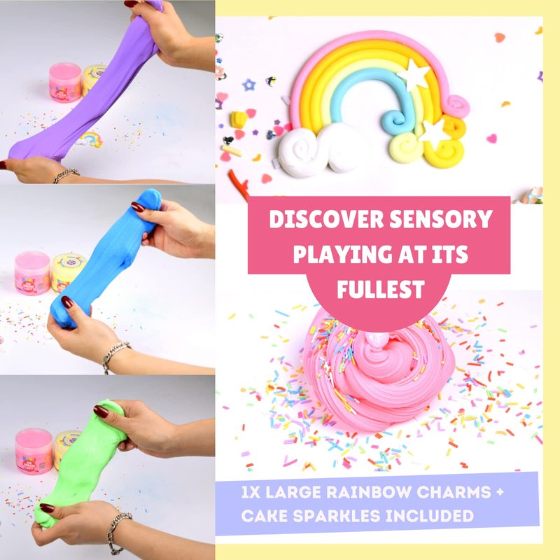 - 6 BUTTER SLIME WITH CAKE CHARMS - Develop children’s imagination, create ice cream slimes for fun. This kit has butter slime in 6 colors for small or larger kids party gathering. Unpack the Cake themed slime out of the pots, discover the cakes charms included inside.