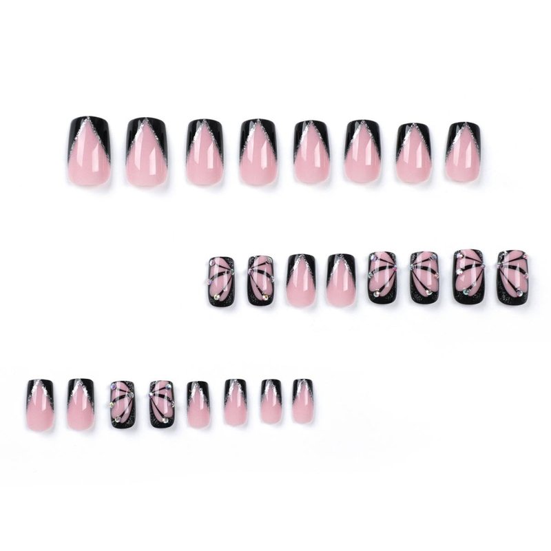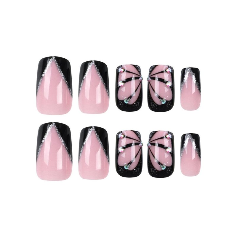 Butterfly Press on Nails Medium Square French Tip Fake Nails Black with Rhinestones Glitter Design Acrylic Glue on Nails Full Cover Pink False Nails Stick on Nails for Women Girls Manicure 24Pcs
