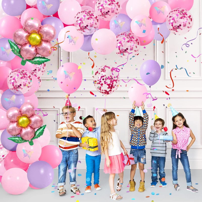 - Complete Butterfly Party Decorations: 50 Pcs in 5 colors beautiful party balloons and 2 lovely foil flower balloons, 1 butterfly "Happy Birthday" Banner,1 butterfly Tablecloth, 8 Pcs 3D Butterfly,10m Pink Balloon Ribbon, 1Pcs balloon strip, 1 Pcs balloon tying tool device and glue dots. You don't need to spend a lot of time choosing different birthday decorations and tools and it is cheaper than buying them individually.