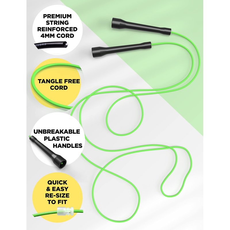 - High Speed Jump Rope With Adjustable Length: Our kids jumprope are trusted by schools, teams, clubs and have a snap lock system that allows you to easily adjust the length of the unbreakable rope to your specific needs, making it perfect for people of all ages and skill levels.