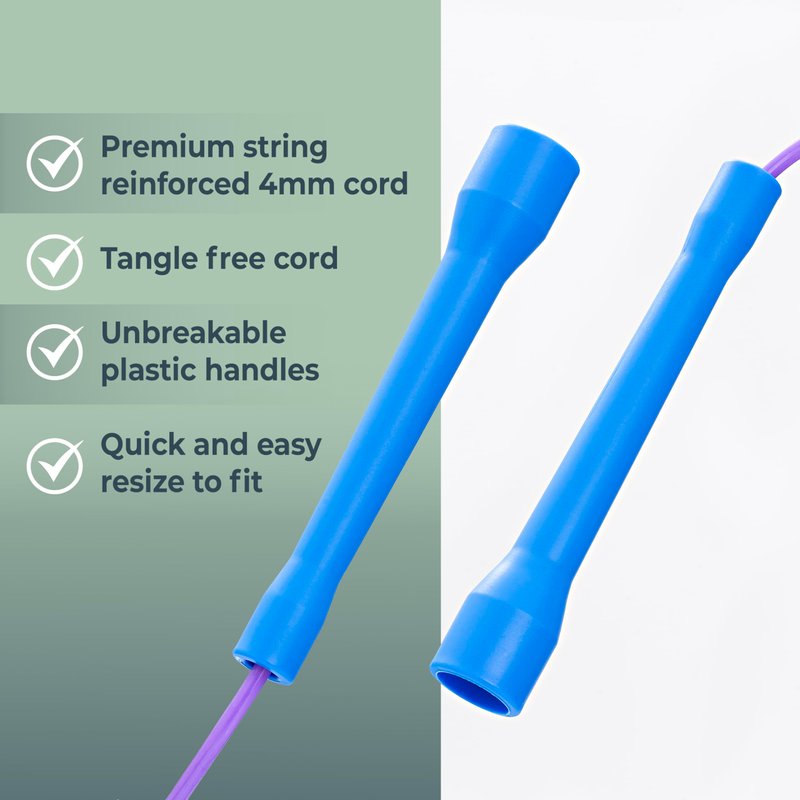 - Color-Handles: Four different sizes are available for our speed rope, each with a color-coded handle for easy identification: Color: white, blue, green, and purple. Size: 7 feet, 8 feet, 9 feet, and 10 feet.