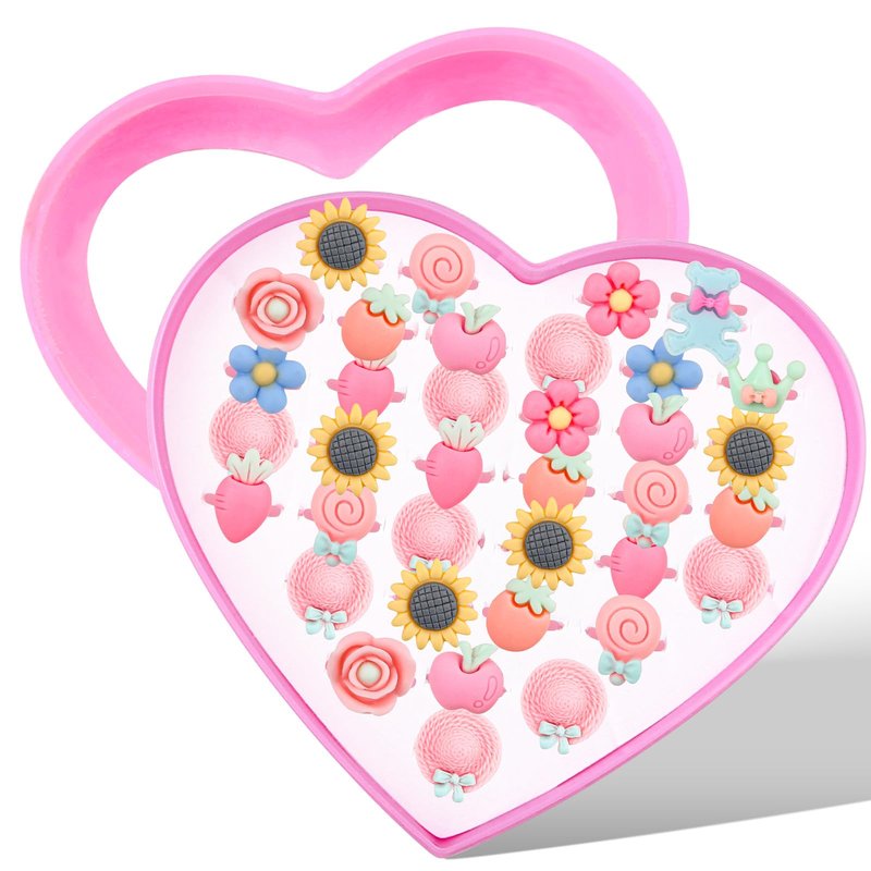 Includes 36pcs little girls jewelry rings in a box, featuring various styles with banana, watermelon, rabbit and so on.