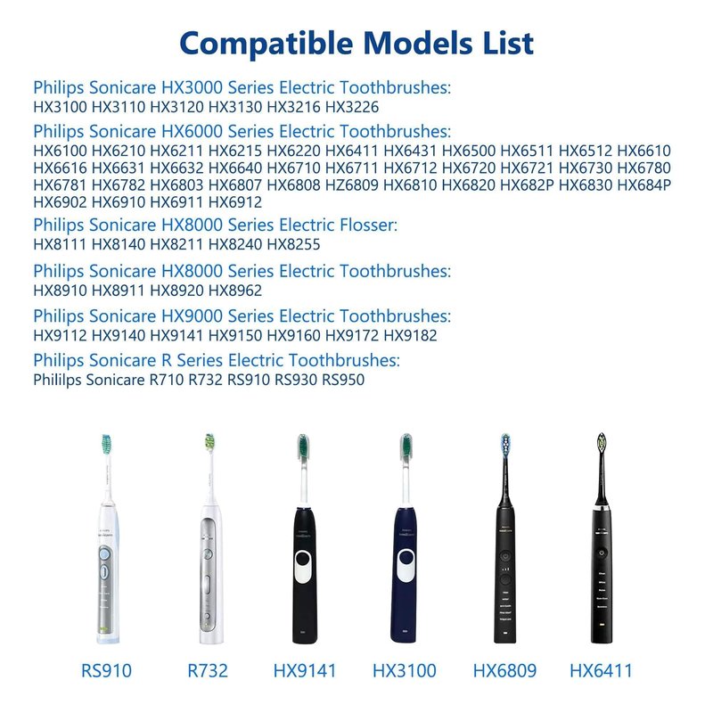 - â ăProduct CompatibilityăCompatible with electric toothbrush & Flosser models HX3000 HX3100 HX3110 HX3216 HX3226 HX6100 HX6210 HX6220 HX6225 HX6231 HX6250 HX6263 HX6311 HX6320 HX6411 HX6431 HX6500 HX6511 HX6530 HX682P HX684P HX686P HX6902 HX6910 HX6911 HX6912 HX6920 HX6921 HX6930 HX6932 HX6933 HX6942 HX6950 HX6952 HX6962 HX6970 HX6972 HX6980 HX6992 HX6993 HX8111 HX8140 HX8211 HX8240 HX8255 HX8910 HX8911 HX8920 HX8962 HX9112 HX9140 HX9141 HX9150 HX9160 HX9172 HX9182 R710 R732 RS910 RS930 RS950