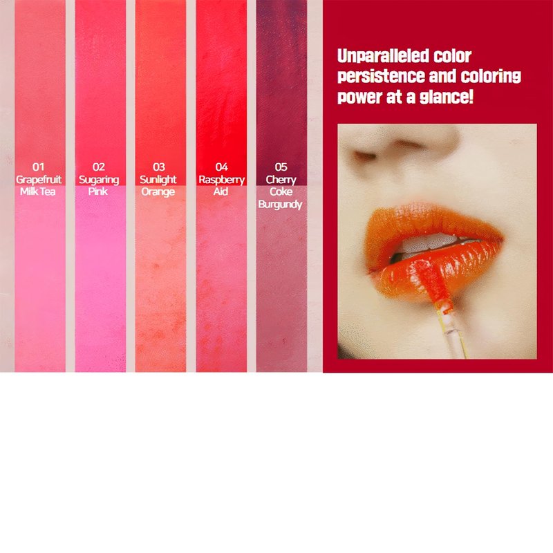 - 5 TRENDY COLORS: 1. Grapefruit Milk tea-Coral color for clear skin. 2. Sugaring Pink-Pink color like Blossom. 3. Sunlet Orange-Attractive orange red like bursting fruit juice. 4. Raspberry Ade - For daily life and special day. 5. Cherry Coke Burgundy-Deep rose color for mood