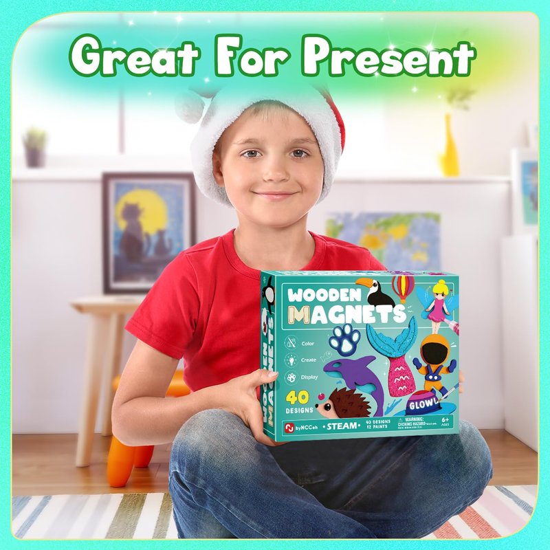 - Byncceh DIY Wood Magnet Craft Kits: The package includes 40 wood magnets, 12 colors (of which 1 night lights), 4 brush, 2 glitter, 1 palette, 1 instructions. You can let your imagination run wild and mix and match colors to paint your own fridge stickers. And unlike other sets, with our set you can get magnets that can glow in the dark!