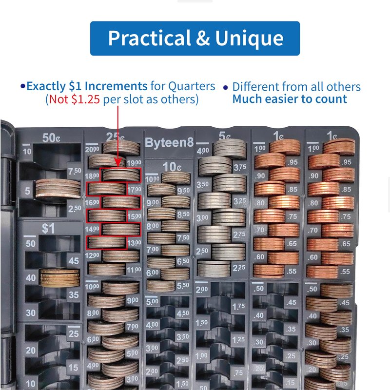 - All Exactly One Roll Design: Byteen8 Self-Counting Coin Tray is Exactly Full Roll Designed. One Roll One Group. Super Easy to Count & Wrapp. Great Money Teaching & Learning Tool for Kids as a Gift. Perfect Loose Change Tray to use with Coin Wrappers.