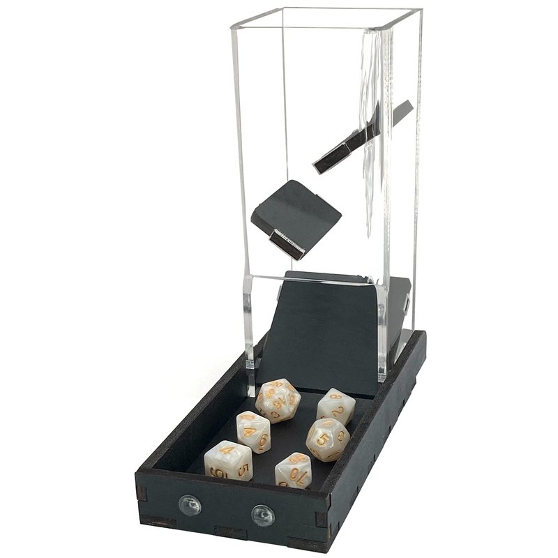 - Treat yourself to this modern interpretation of a dice tower which combines extra thick clear acrylic and finished laser-cut wood. The transparent sides allow the dice to be seen inside and channels a satisfying sound as the dice fall through.