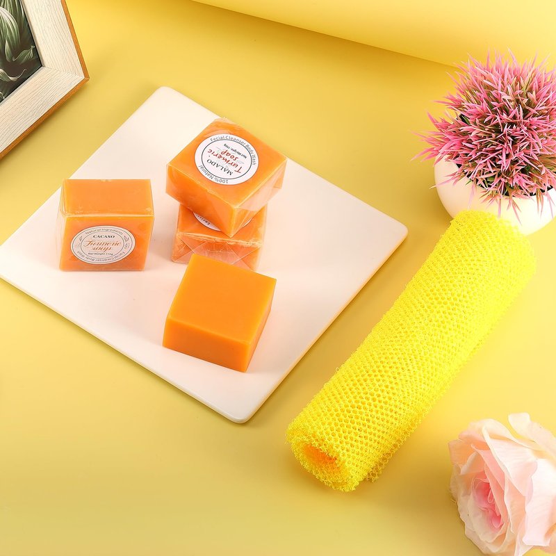 Package contains 2pcs turmeric soap bar and give away a soap foaming net. Every piece weighs 110g, carefully made to ensure high quality.