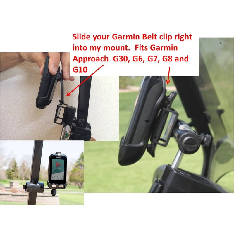 Golf Cart Mount For Garmin G6, G7 G8 G30 and G10. Your gps will work great with the Caddie Buddy. Just slip the Caddie Buddy around the roof support post and tighten the thumb screw. Then slide the belt clip from your Garmin right into the mount. (note: Your Garmin does need to have the belt clip on it. It should of came with your Garmin. I don't supply the belt clip. Sorry) Made in the USA