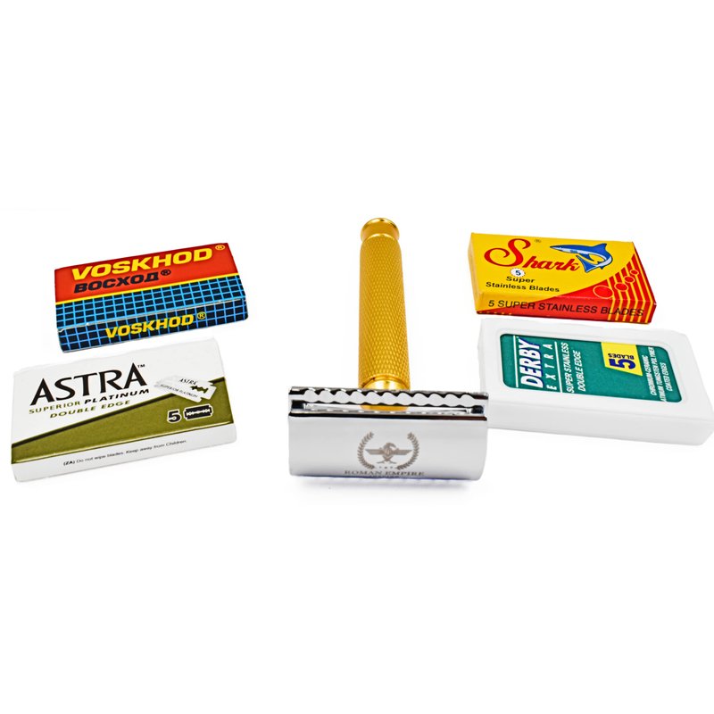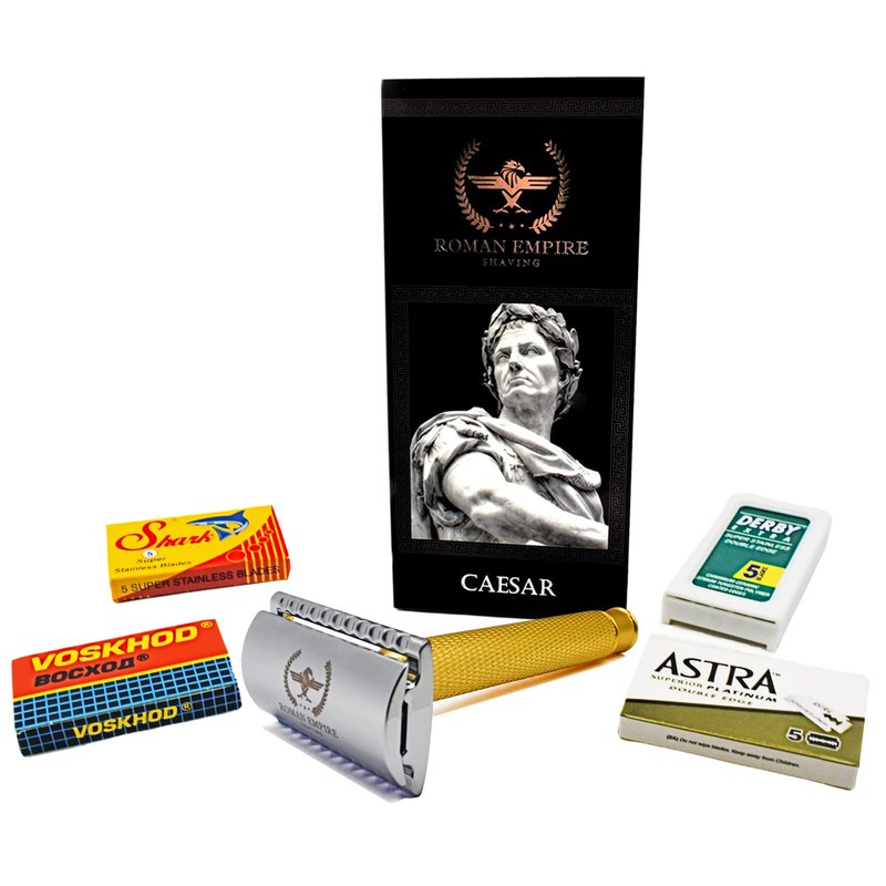 Caesar Gold Double Wire Safety Razor by Roman Empire Shaving | Classic Razor | Safety Razor | Steel Razor with Set of 20 Shaving Blades (Astra-Derby-Shark-Voskhod)