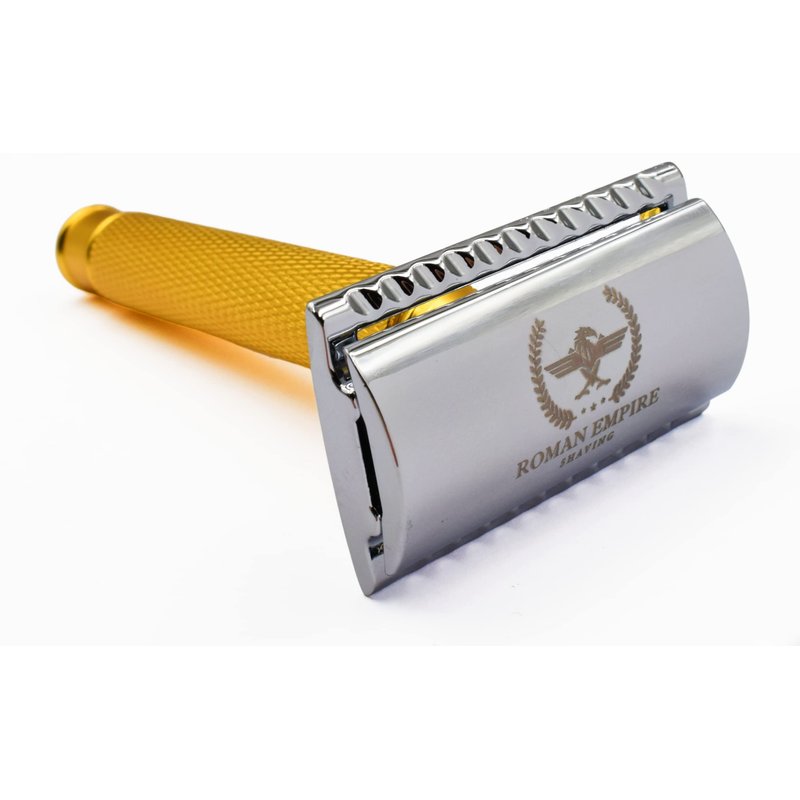 - Safety razor for double wire blades with golden handle made by Roman Empire Shaving. Handle 8.5 cm, weight 92 g