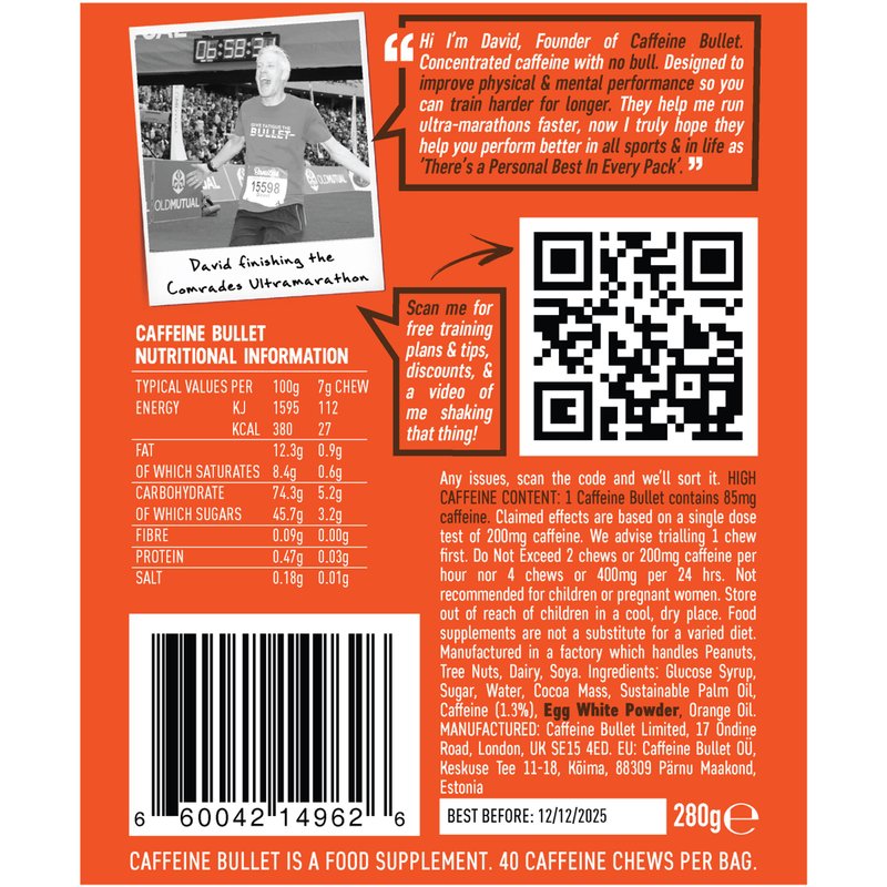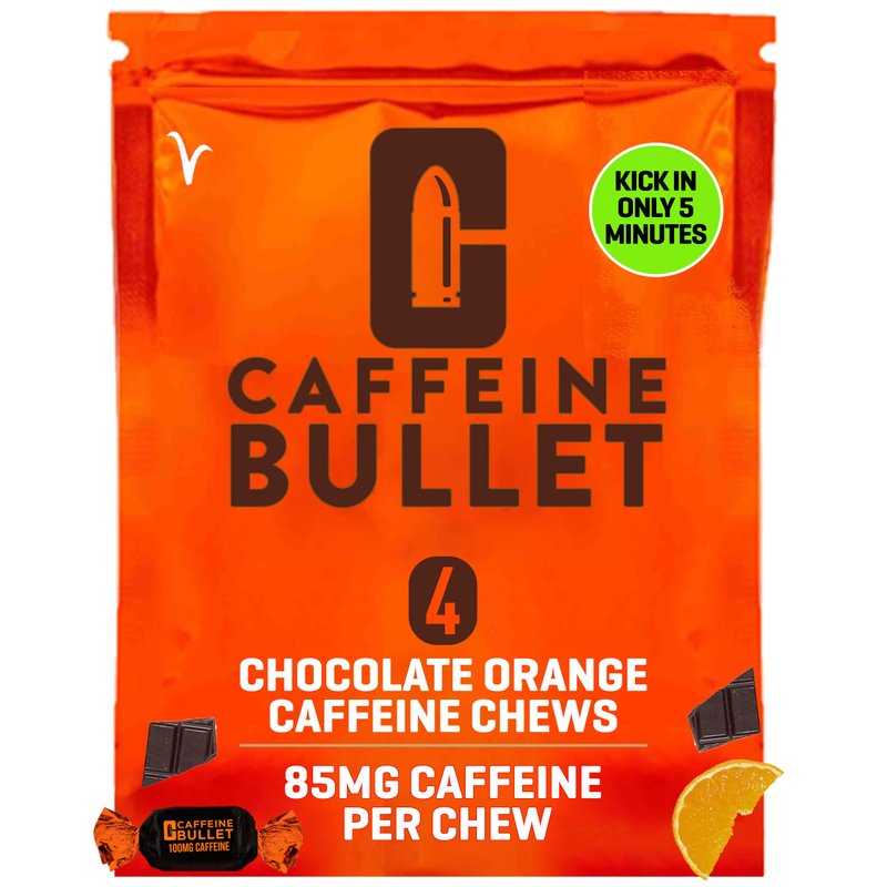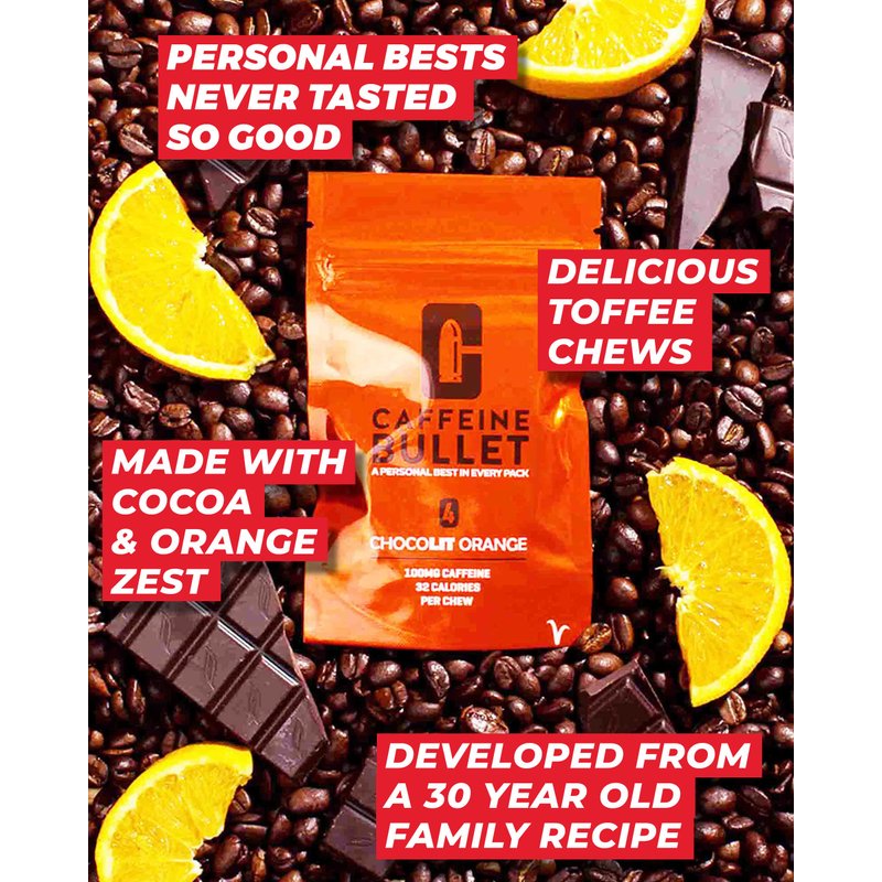 Caffeine Bullet is a chocolate orange energy chew, designed to kick in only five minutes, peaking in your bloodstream three times faster than energy gels, drinks and caffeine pills so that you are back to best performance almost instantly. Caffeine increases endurance, improves concentration and mobilizes your fat cells as a fuel source, so that you can train and race harder for longer. There’s 85mg caffeine in every chew – more than a strong coffee and with 4 chews in every packet there’s 'a personal best in every pack'. Ultrarunning Champion David Hellard designed Caffeine Bullet as a convenient way to quickly take strong caffeine to allow him to race faster, but you can harness its power whenever you need to perform at your best, whether thats's in sport, gaming, studying or even on the dancefloor. So don't fill yourself with bull, drink a monsterous amount of calories or let your energy drop off a clif; give fatigue the bullet - Personal Bests Never Tasted So Good!