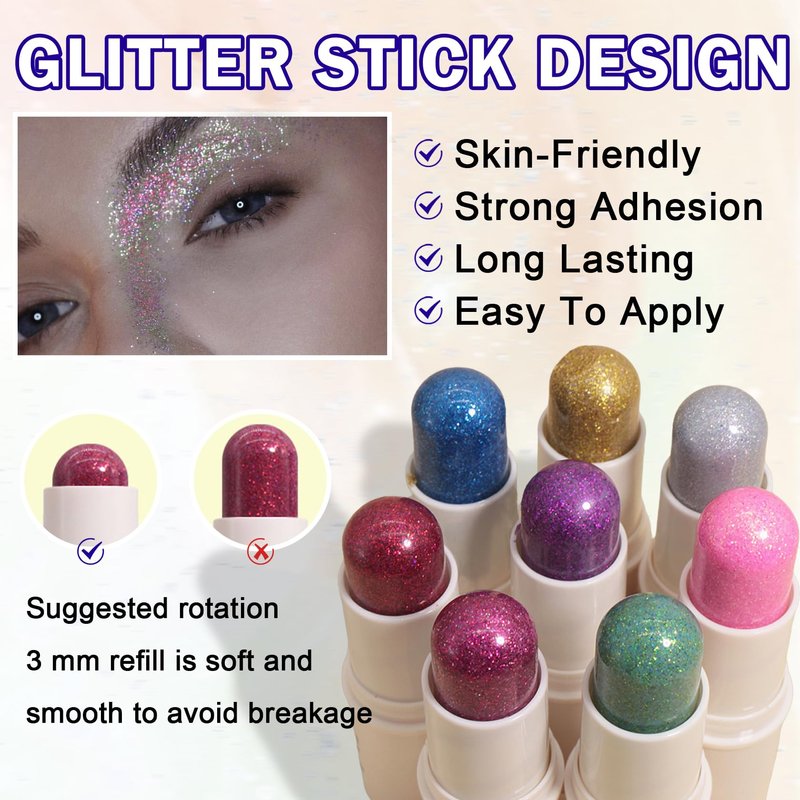- How to Use: Glitter gang has good stickiness, no need to use glitter glue. Gently slide the body glitter stick and apply it evenly on the parts where you need to increase the gloss. You can increase the number of applications as needed to create a more ideal makeup effect