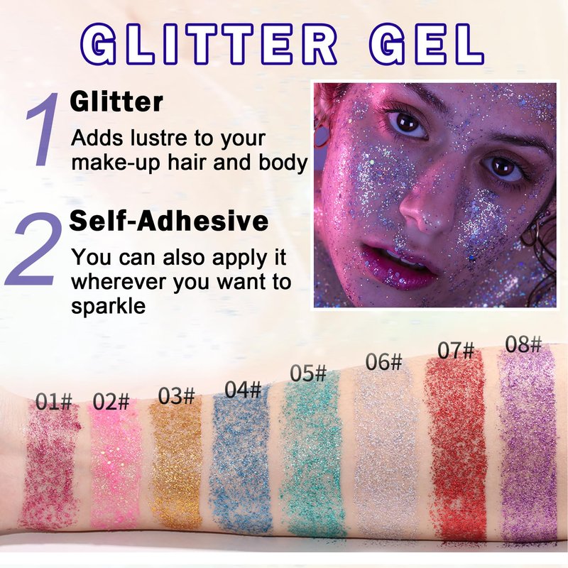 - Glitter Makeup: Glitter gel are made with high-intensity pigments and holographic gloss that deliver rich, vibrant color on skin, giving you a stunning sparkling look that will shine even more under the light