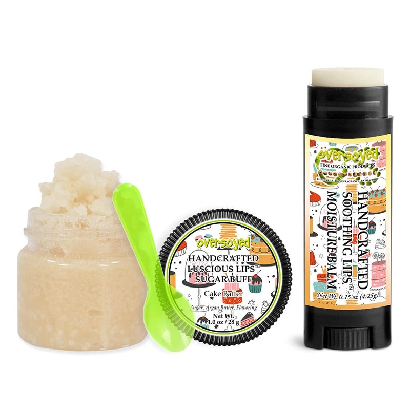 Cake Batter Soothing & Luscious Lips by OverSoyed Exfoliator & Chapped Lip Repair Lip Care Combo | Artisan Handcrafted to Order Vanilla Cream Buttercream Flavored Exfoliating Sugar Lip Scrub & Lip Moisturizer Balm Gift Set