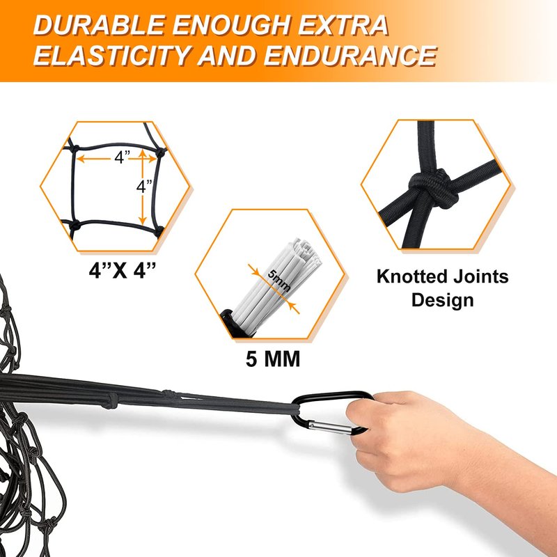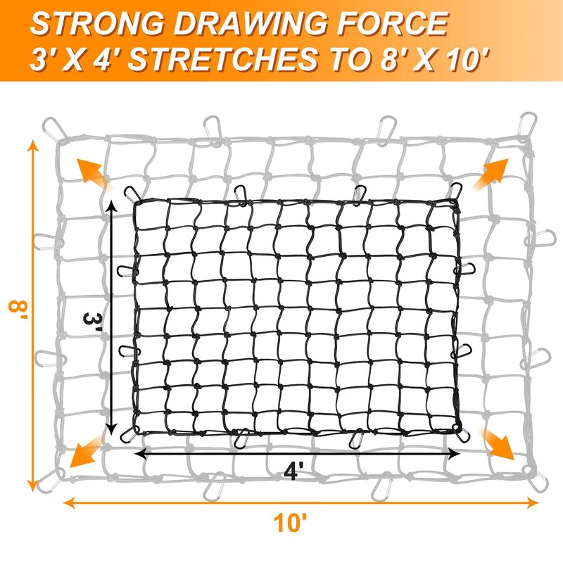 - Stretch to 8'x10': 3'x4' bungee cargo net can stretch to 8'x10' to accommodate the size of your items and is designed with tight 4” x 4” mesh netting and knotted joints, truck bed cargo net keeps small items from falling out and provide more strength and protection for large cargo items in transportation