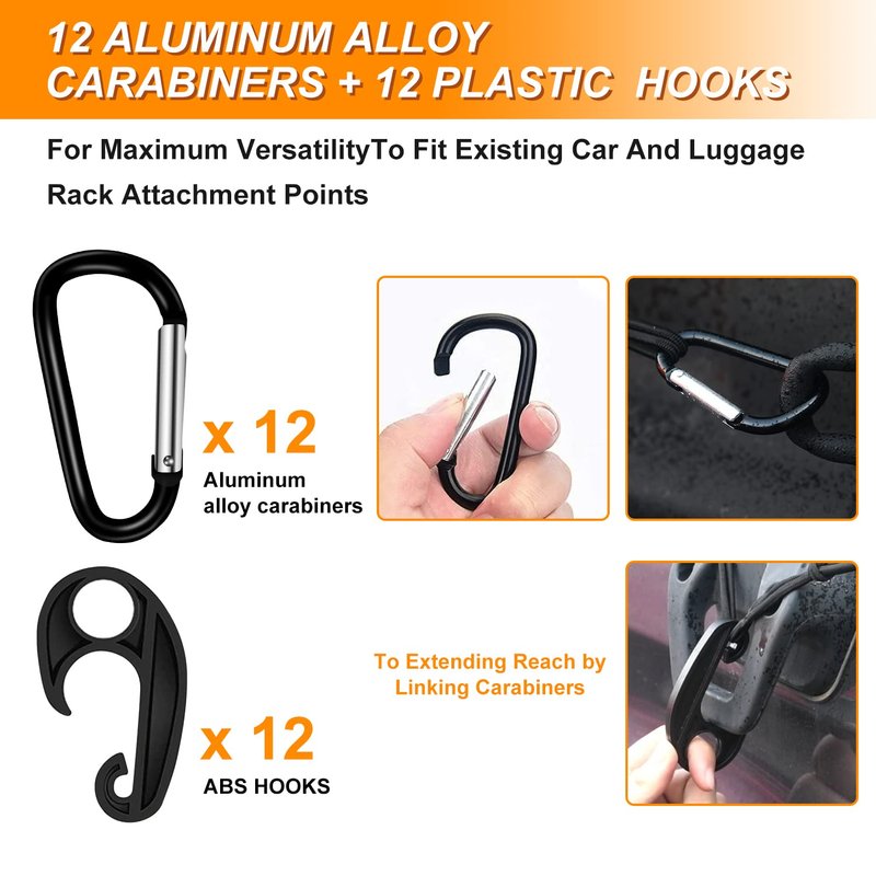 - 24 Pcs Heavy-Duty Hooks: Each cargo netting set is coming with 12pcs heavy duty durable aluminum D-clips, 12pcs universal ABS plastic clips, total 24pcs hooks. The included carabiners use anodized aluminum alloy for corrosion-gratis performance even under punishing use