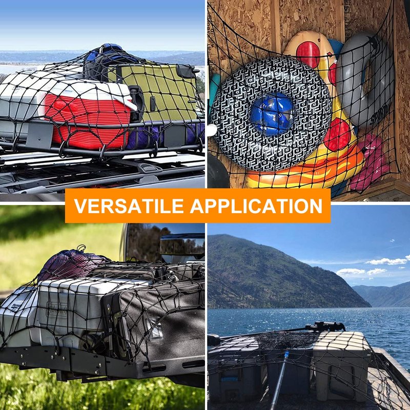 - Universal Mesh Cargo Nets: This pickup truck cargo net is perfect for rooftop cargo carriers and luggage racks for pickups, trucks, trailers, jeeps, GMC, SUVs, ATV/UTVs, boats, and so on