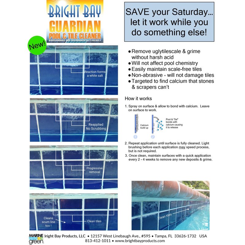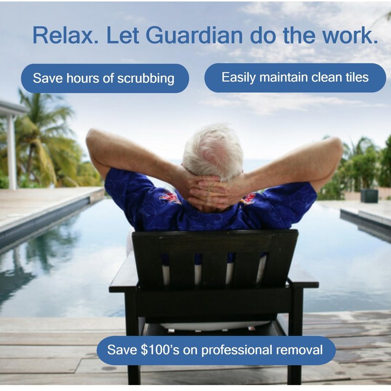 - PUMICE STONES CAN TAKE HOURS - Guardian works while you do something else. Spray on scaled surfaces & leave it. Removes scale progressively (see photos). Apply weekly until scale is gone. Heavier scale will take more applications. This is an "above the waterline" treatment. SCOURING NEVER REMOVES 100% OF DEPOSITS. Stones not going to work on textured or sculpted tiles. GUARDIAN FINDS CALCIUM YOU CAN’T SEE. Also breaks down scum line.