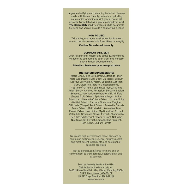 The Clean Slate is a 100% vegan, plant-based and a non-GMO skincare product that's the result of meticulous craftsmanship. We teamed up with world-renowned scientists to create a completely non-toxic product that's proven to give you your best skin ever. Based on extensive research and clinical trials, we set out to surpass conventional methods and create a product clinically proven to deliver incredible results. Our simple 3-product regimen features our award-winning serum, The Good, with the addition of a revolutionary cleanser, The Clean Slate, and day moisturizer, The Base Layer. The trio is designed to be an easy, 3-step process for all skin types. For a bonus exfoliating skincare treatment, use The Deep, our gentle, reviving clay mask. We're committed to Transparency, Sustainability, and Excellence. Our products are certified by the world's leading, independent regulatory agencies. Caldera + Lab was founded with one pioneering goal: to build a results-driven men's skincare brand that was uncompromising in its commitment to social and environmental wellbeing. As a result, we are now one of a handful of U.S.-based personal care companies to receive the prestigious B Corp certification.