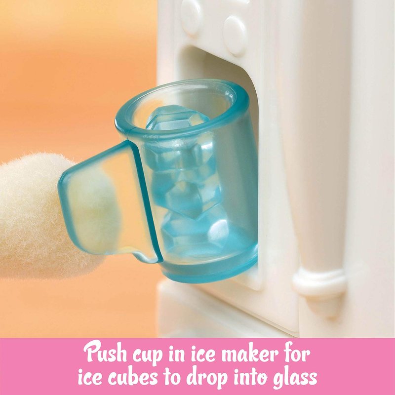 - Features furniture and accessories with functional features, including a flushable toilet, sink with running water, refreigator with ice dispenser and more.
