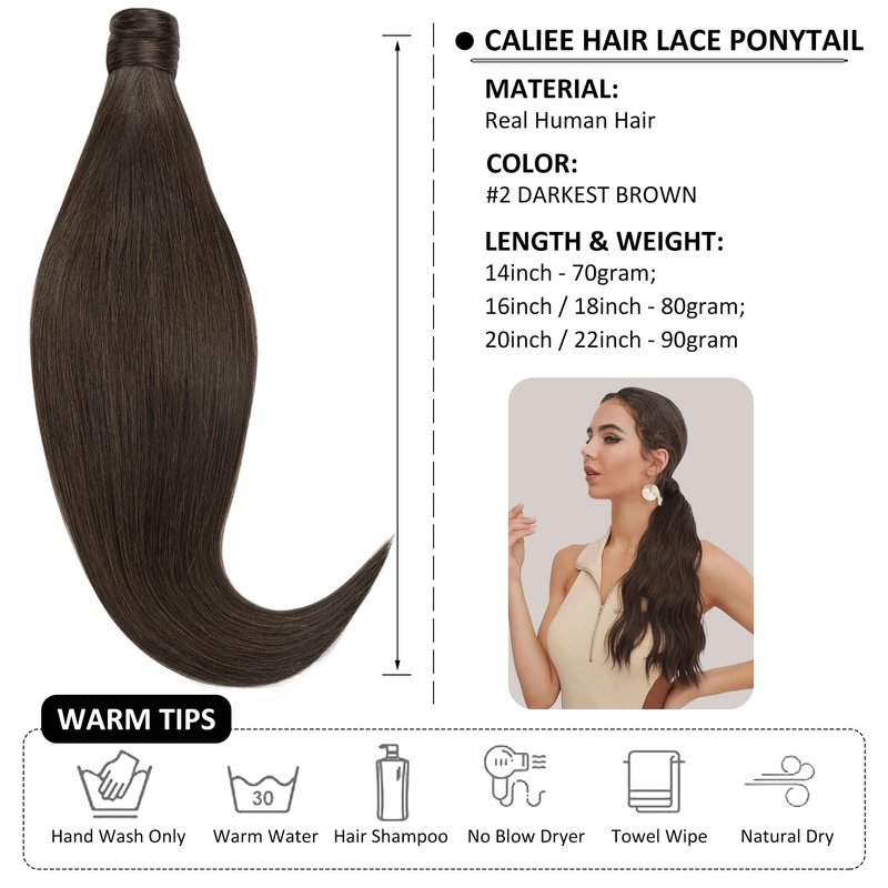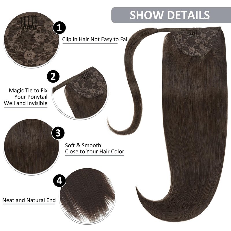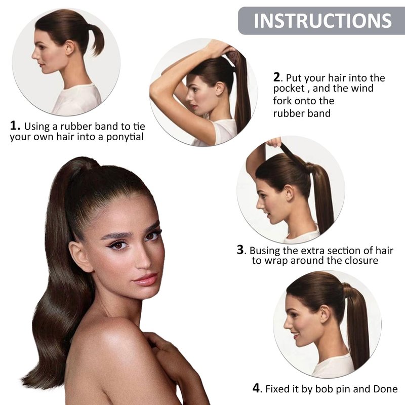 【Wrap Around Ponytail】: Hair Material: 100% remy human hair Hair Length: 14"-22" Hair Weight: 70-90g Hair Style: Silky Straight Hair life: 6-12 months (depends on use and care) 【How to wear a wrap around ponytail】: ①Tie up you hair to a ponytail. ②Insert the comb into hair (above the rubber band). ③Wrap the strap of hair around your own ponytail and fix it with the magic paste. ④Wrap the rest part of hair till its end and fix it with a bobby pin. 【About Washing & Dry】: You need to wash hair extensions after every 20 wears.Only use warm water when washing ponytail hair extensions.Use sulfate-free and alcohol-free shampoo and hair care products. Never blow dry your human hair extensions, but instead air dry them for best results.We recommend air-drying your ponytail extension using a microfibre towel.Straight ponytails could be hanged for drying. 【About Care】: Carefully and gently brush your tail from the bottom of the hair slowly working upwards towards the root. If you come across a particularly pesky knot, patiently detangle it by your fingers first. Never brush your ponytail when it is wet as this is when it could easily break. Use a wide-tooth comb or a soft-bristle brush.