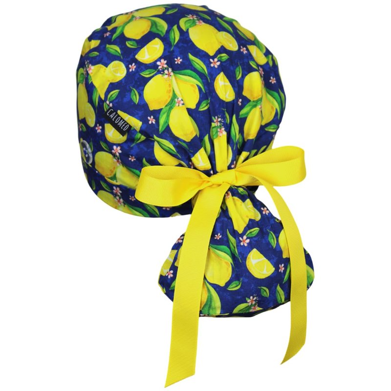 CALOMED Scrub Cap for Women and Men, Ponytail Scrub Caps, Working Hat, Head Cover with Ribbon Ties and Buttons, Long Hair (Lemon and Flowers on Blue)