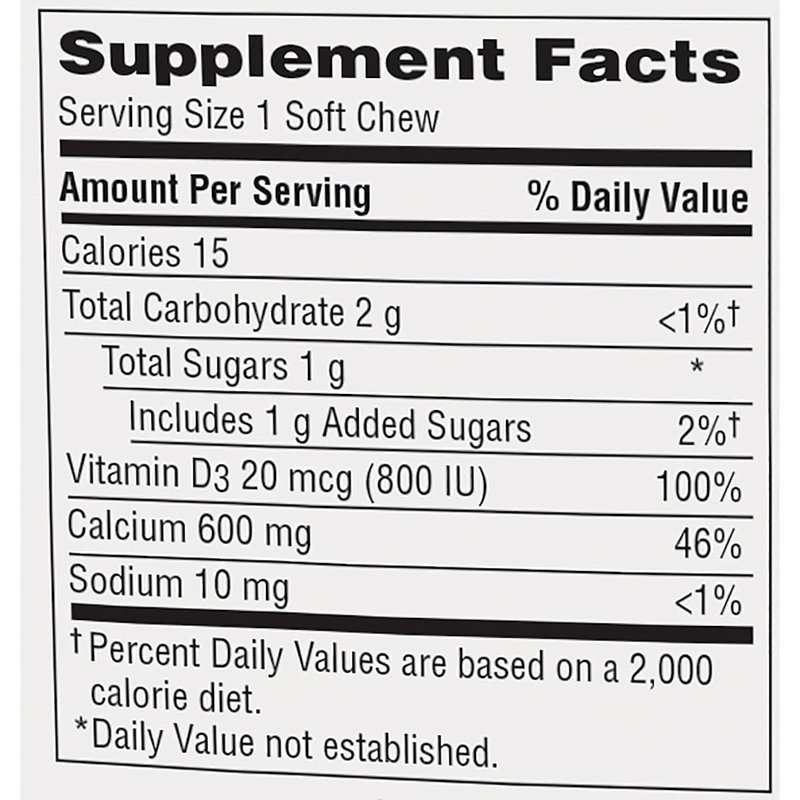 - Calcium with vitamin D bone support supplements contain 600 mg calcium and 20 mcg of vitamin D3 per soft chew