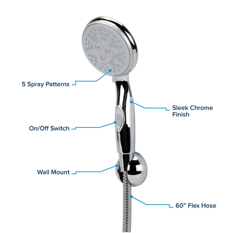 - Kit includes showerhead, 60" flexible hose, washers, wall mount and installation hardware
