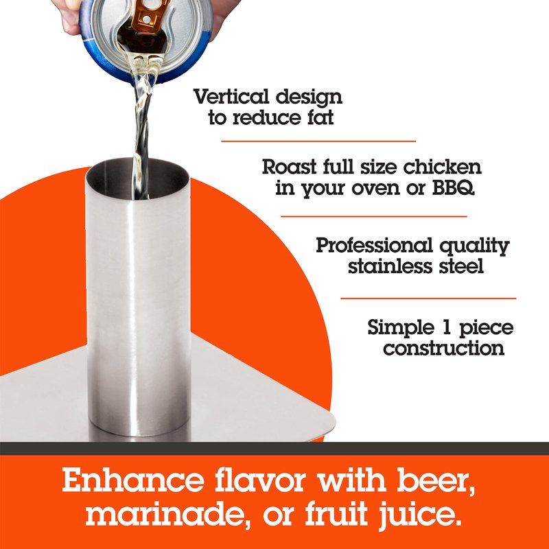 - With the Camerons Stainless Steel Beer Can Roaster you can enjoy tasty chicken meals without the stress of having to use an actual aluminum beer can which contains inks that may rub off onto your food while cooking.