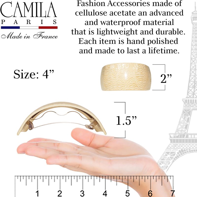 Camila Paris CP3621 Size 4.25 inch French Hair Accessories, Hair Barrettes, Rectangular. Strong Hold No Slip Grip for Women and Durable Styling Girls Hair Ornaments. Made in France with Cellulose Acetate. With its beautiful and timeless designs featuring styles as hair barrettes for women, hair clips, ponytail holders, hair bananas, headbands, Hair pins, and more, decorated with unique designs, prints, and patterns. Handmade pieces are ideal for special occasions and include a large selection of hair ornaments for everyday use. We count with innovative features such as French Grip System ideal for fine hair, Spring Cover no visible hinge, Grip Link hinge replaced for a durable rubber band that holds better and maintain the due hair for all day. Camila Paris collection are for all hair types, fashion hair clip tools for black brown dark light brunette blondes red heads; use for adults with curly wavy straight frizzy fine thin long medium mid back shoulder length hairstyle; cutting curling coloring drying or straightening. Camila Paris 20 years of professional experience and products knowledge, a high quality hair ornaments line. A staple of excellence in the hair accesories industry Camila Paris 20 years of professional experience and products knowledge, a high quality hair ornaments line. A staple of excellence in the hair accesories industry
