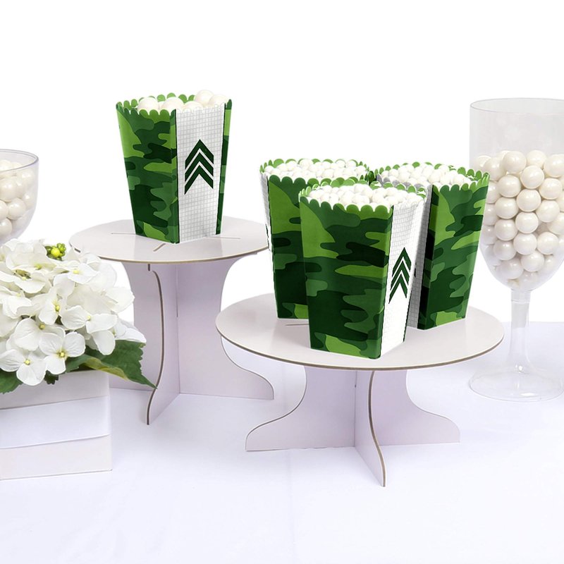 - Camo Hero Favor Popcorn Treat Boxes INCLUDES 12 Army party favor boxes. Camo Hero treat boxes are perfect for any event. The camouflage theme is great for a baby shower or birthday party.