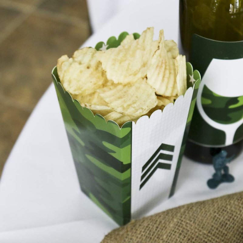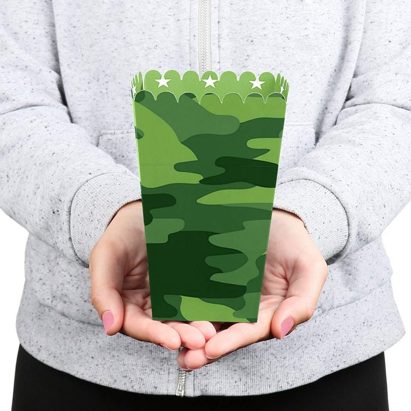 - POPCORN BOX PARTY SUPPLIES: Camo Hero popcorn boxes will hold a variety of party food. Fill them with sweet treats or salty snacks. Popcorn, caramel corn, candies and other goodies will look amazing on your candy buffet with these Army favor boxes.