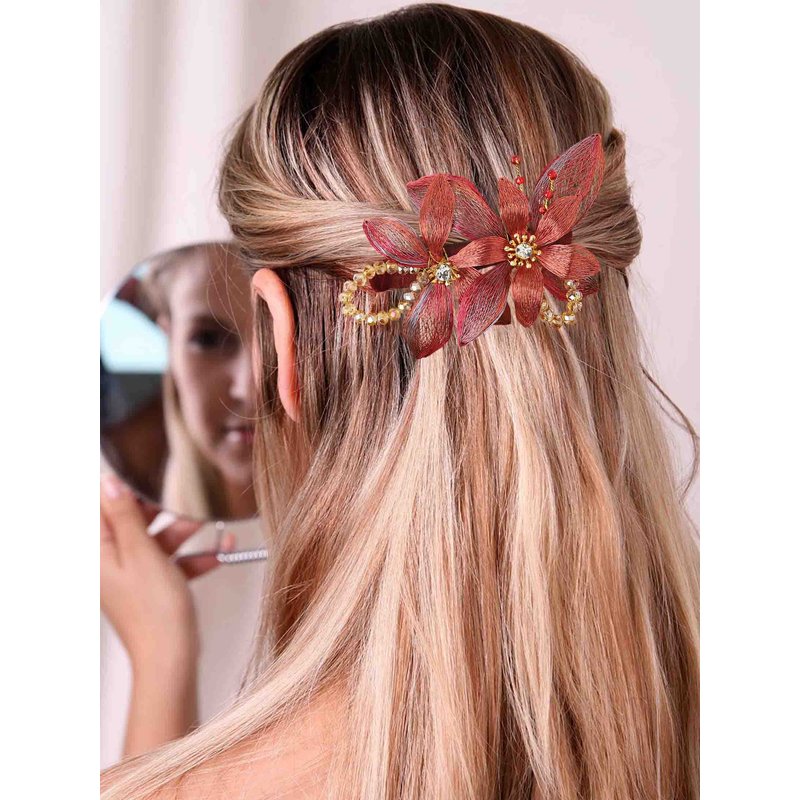 - Carefully pack each flower hair clip in a present box, it is the most exquisite present for the bride. Rhinestone bridal hair accessories hand pinched flowers and leaves shape, very realistic and beautiful ladies headdress.
